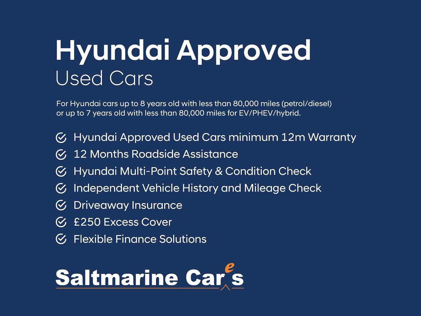 Our standard Approved Used cars also come with a warranty – Balance of manufacturer warranty for cars less than 5 years old, or retailer supplied warranty options for cars more than 5 years old. This is applicable to Hyundai cars with less than 80,000 miles and no older than 8 years old (petrol/diesel), or 7 years old if electric, plug-in hybrid or hybrid.